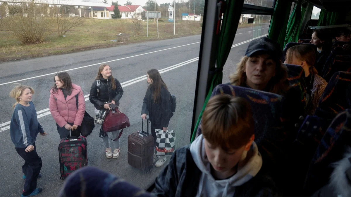 Дети, находившиеся в организованных Россией летних лагерях и вывезенные с неподконтрольных территорий, ждут посадки в автобус после возвращения в Украину через границу с Беларусью, Волынская область, 7 апреля 2023 года. Фото: Valentyn Ogirenko / Reuters / Scanpix / LETA