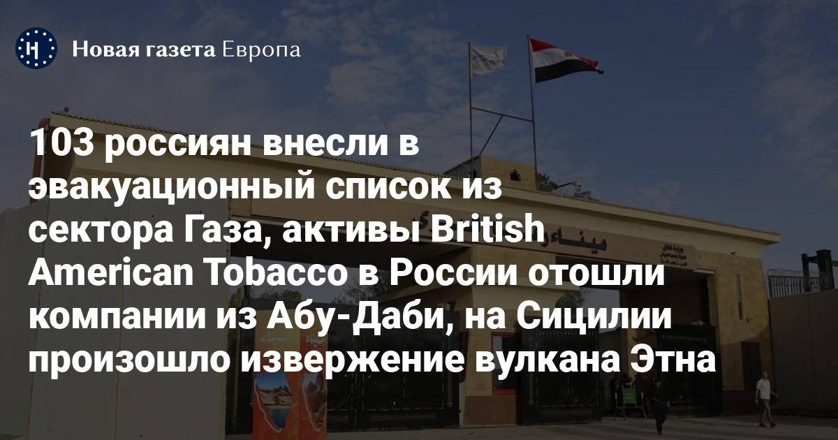 103 россиян внесли в эвакуационный список из сектора Газа, активы British American Tobacco в России перешли компании из Абу-Даби, на Сицилии произошло извержение вулкана Этна