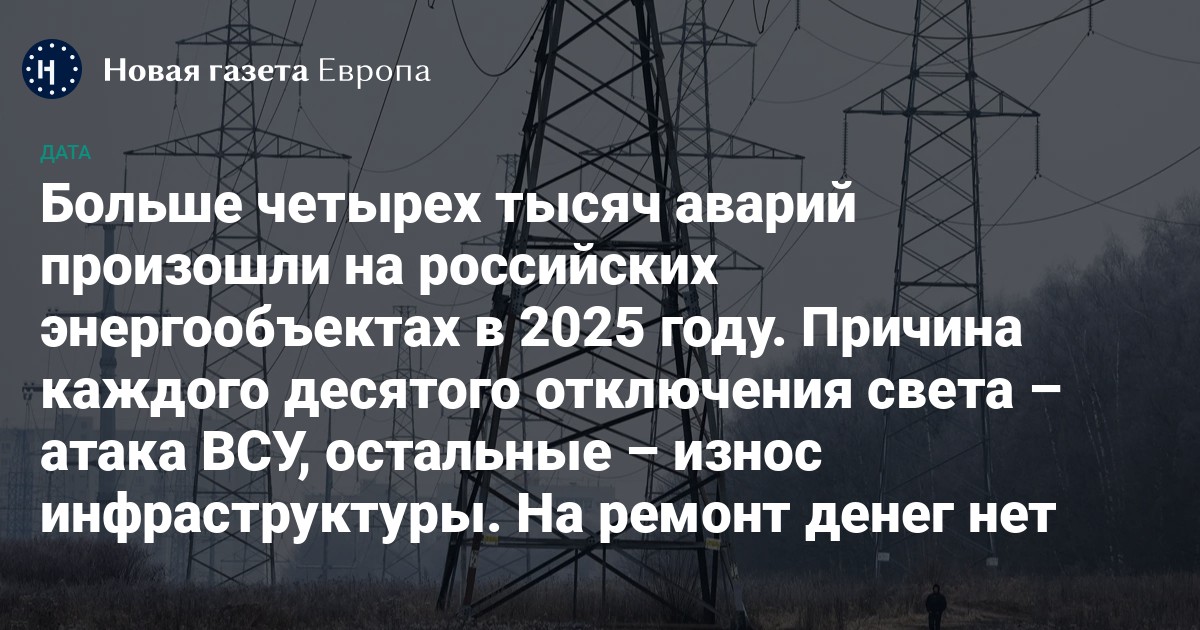 С начала года на энергообъектах в российских регионах произошло 4189 случаев отключения электричества по разным причинам, это уже больше на треть, чем за весь прошлый год, подсчитала «Новая газета Европа». При том, что зимний сезон только начался.