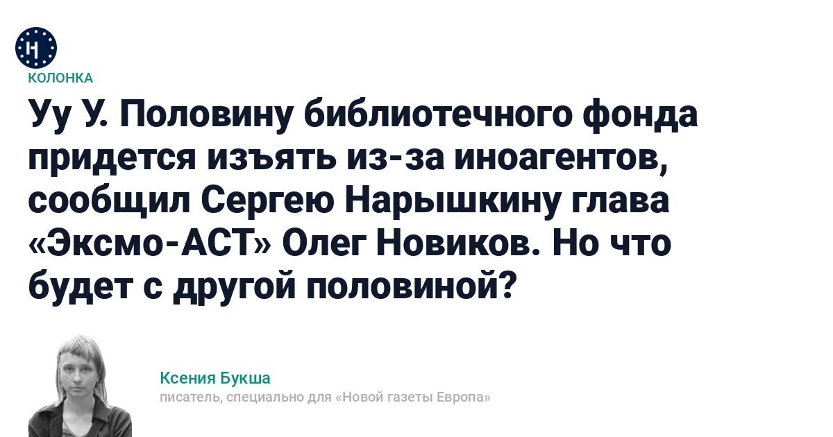 Президент издательской группы «Эксмо-АСТ» Олег Новиков рассказал разведчику Сергею Нарышкину (на заседании Организационного комитета по поддержке литературы, книгоиздания и чтения в РФ, возглавляемого начальником СВР) что, если буквально исполнить законодательства об иноагентах и нежелательных организациях, то придется изъять более 50% библиотечных фондов России.